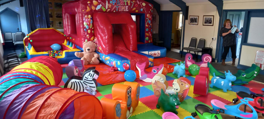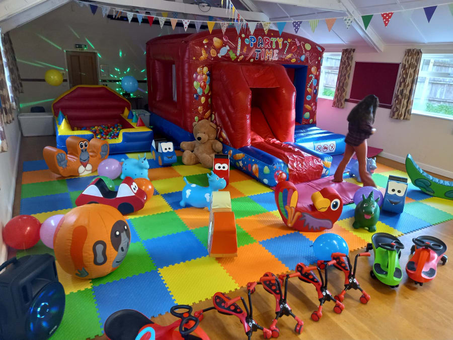 Premium party slide bouncy castle, inflatable ball pool with floating balls, colourful soft play matting with premium extra soft play package, big teddy bear called George, ride on toys & diddi cars, animal space hoppers, punch balloons & disco lights.