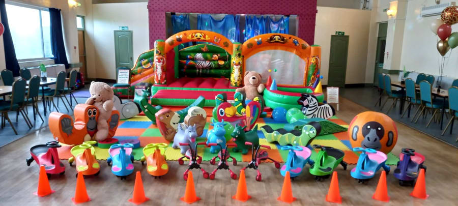 Enhance the jungle vibe with our luxurious Jungle themed soft play MEGA PACK. It features an expansive colourful matting area, animal space hoppers, extra diddi cars, and an array of ride-on toys. Let kids bounce around with George, the huge teddy, or engage in dynamic play with punch balloons and disco lights!