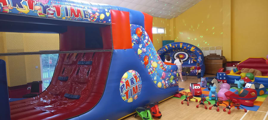 MEGA FUN RUN inflatable with 9ft slide and biff and bash fun inside, awesome soft play ball pool with a huge teddy bear called "George", deluxe soft play package, animal space hoppers, Diddi cars, ride on toys, DELUXE NERF SHOOT OUT package, 800 watt bluetooth disco speaker, punch balloons and disco lights.